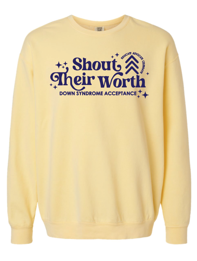 Wrap yourself in comfort and advocacy with our “Shout Their Worth” Comfort Colors Crewneck! Made from ultra-soft, high-quality fabric, this cozy sweatshirt is perfect for showing your support for individuals with Down syndrome while staying stylish and warm.